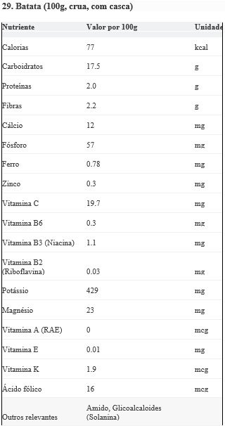Fonte Principal De: Carboidratos (amido), Potássio, Vitamina C, Vitamina B6, Fibras (especialmente na casca).