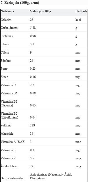 Curiosidades: A casca da berinjela, de cor roxa, é rica em antocianinas, poderosos antioxidantes. A berinjela é tecnicamente um fruto, uma baga.