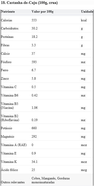 Funções: O cobre e o zinco são importantes para a imunidade e metabolismo. O magnésio e o fósforo são essenciais para a saúde óssea e função nervosa. As gorduras saudáveis beneficiam a saúde cardiovascular.
