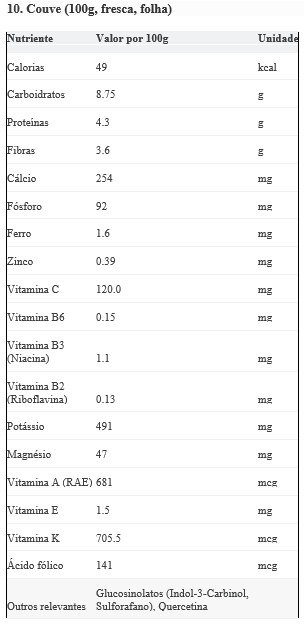 Fonte Principal De: Vitamina K (extremamente alta), Vitamina A (via beta-caroteno), Vitamina C, Cálcio, Folato, Fibras. Contém também potentes antioxidantes como glucosinolatos (precursores de sulforafano e indol-3-carbinol) e quercetina.