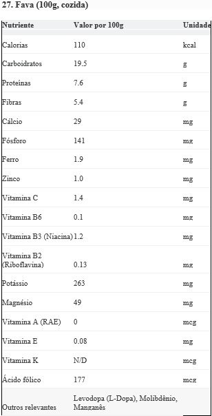 Funções: As fibras auxiliam na saúde digestiva e na saciedade. As proteínas são essenciais para a construção muscular. O folato e o ferro são cruciais para a prevenção da anemia. A Levodopa é um precursor da dopamina, estudada por seus potenciais benefícios em doenças neurodegenerativas como Parkinson.
