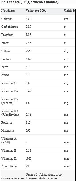 Fonte Principal De: Fibras (altíssima), Ômega-3 (ALA – extremamente alta), Lignanas, Magnésio, Manganês, Fósforo.