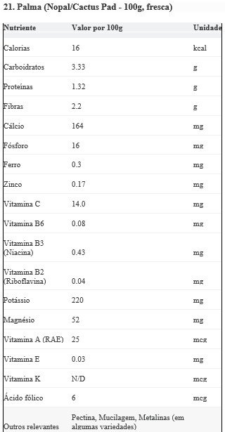Curiosidades: A palma (nopal) é um alimento básico na dieta mexicana há milhares de anos e é considerada um superalimento devido às suas propriedades nutracêuticas.