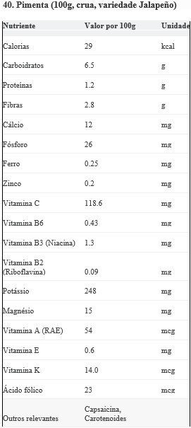Fonte Principal De: Vitamina C (altíssima), Vitamina A (via carotenoides), Vitamina B6, Potássio, Fibras, Capsaicina.