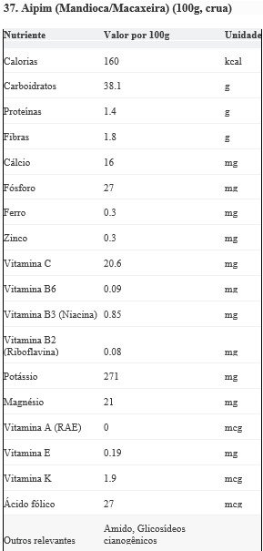 Toxinas (Cianetos): A mandioca contém glicosídeos cianogênicos que liberam cianeto. A mandioca brava (amarga) tem altos níveis e é tóxica se não for processada corretamente (descascar, ralar, lavar, espremer e cozinhar). A mandioca mansa (doce) tem níveis mais baixos, mas também deve ser sempre cozida e nunca consumida crua.