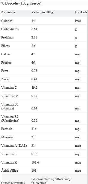 Curiosidades: O brócolis contém sulforafano, um composto que é liberado quando a planta é mastigada ou picada, e tem demonstrado fortes propriedades anticancerígenas em estudos.