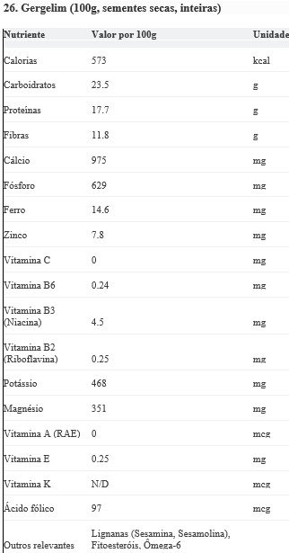 Fonte Principal De: Cálcio (altíssimo), Cobre, Manganês, Magnésio, Zinco, Ferro, Fibras, Proteínas, Lignanas.