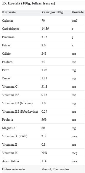 Fonte Principal De: Mentol (óleo essencial), Antioxidantes (flavonoides). Contém Vitamina A, Vitamina C, Ferro e Manganês.