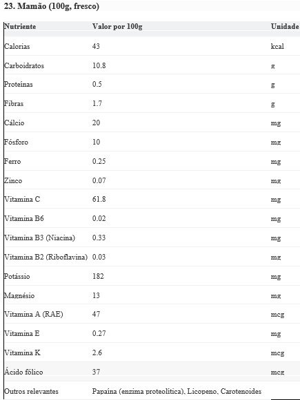 Funções: A Vitamina C fortalece a imunidade e a Vitamina A é essencial para a visão e pele. O folato é crucial para a formação de células sanguíneas. A papaína auxilia na digestão de proteínas. As fibras regulam o intestino.