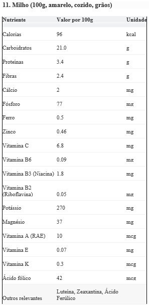 Niacina: A niacina no milho está quimicamente ligada e não é bem absorvida a menos que o milho seja tratado com alcali (processo de nixtamalização, comum no preparo de tortilhas). O consumo exclusivo de milho não nixtamalizado pode levar à deficiência de niacina (pelagra).