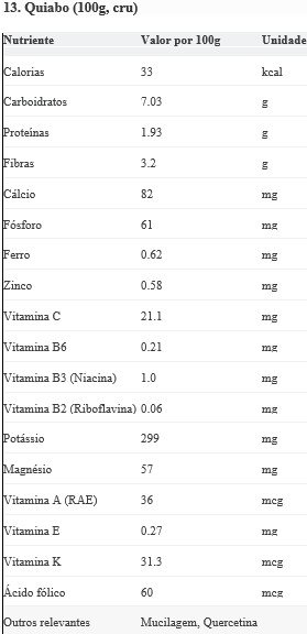 Sugestão: Consumir refogado, frito, cozido em ensopados (como frango com quiabo) ou como acompanhamento.