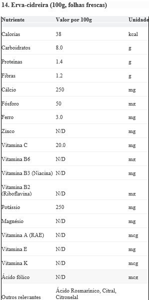 Fonte Principal De: Compostos fenólicos (ácido rosmarínico), Citral e Citronelal (óleos essenciais com propriedades calmantes). Contém também algumas vitaminas e minerais, mas a maior parte é consumida em infusões.