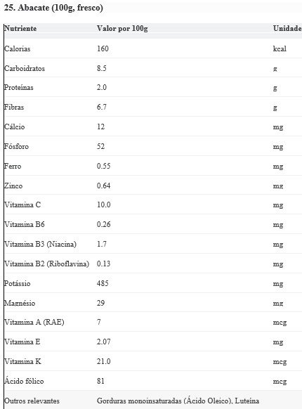 Funções: As gorduras saudáveis contribuem para a saúde cardiovascular e auxiliam na absorção de vitaminas lipossolúveis. As fibras promovem saciedade e saúde digestiva. O potássio é vital para o controle da pressão arterial. Vitamina K para coagulação e ossos. Vitamina E e folato são importantes para a proteção celular e formação de células sanguíneas.